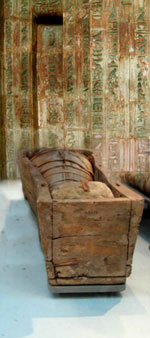 The main item on display in the Egyptian Folly is a mummy claimed by Barnie Bomford to be that of Senapod IV. In the autumn of 1923, the first mummy brought back to Sild Hall was unwrapped (see below) in the Saloon after dinner for the amusement of a number of guests. Unfortunately several artifacts went missing. When Bonford returned a few months later with the mummy of Senapod IV, it was decided to leave him unwrapped (top right). This practice has subsequently been adopted by the British Museum. |